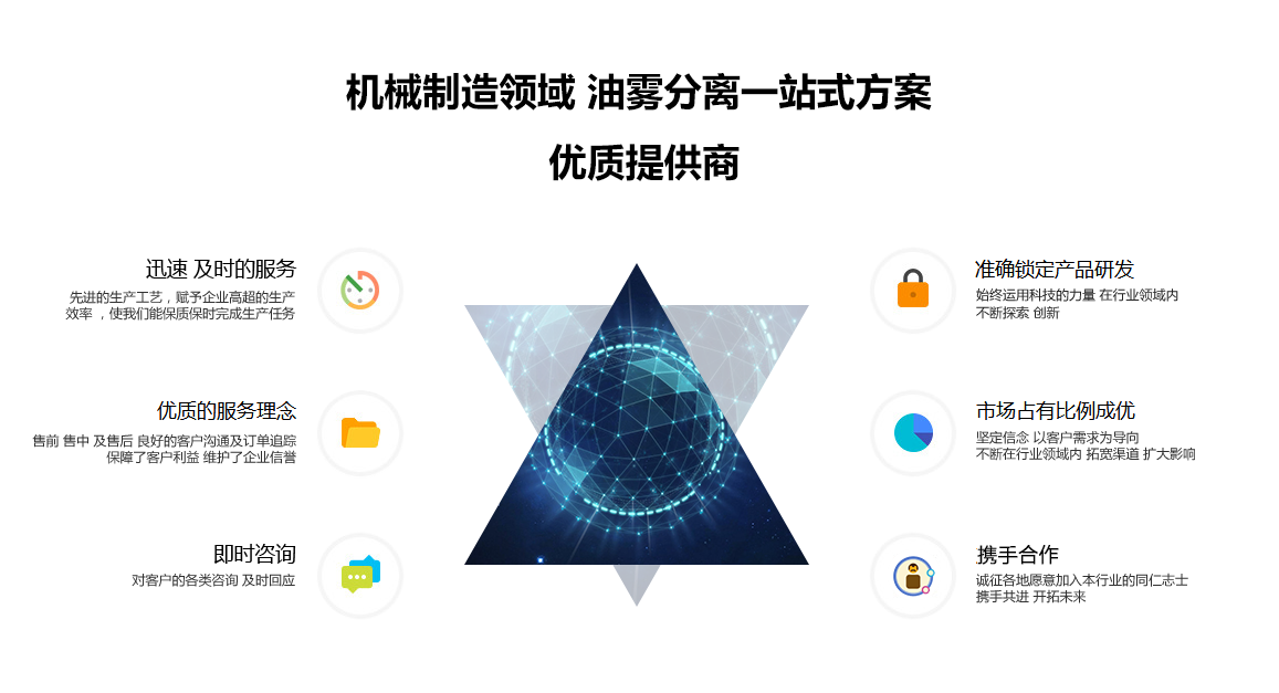 歡迎您來到琦宏的世界,一個專注于創新與品質的世界。琦宏是一家專業生產油霧分離器的廠家,以科技為導向,以環保為使命,致力于為全球提供高效、可靠的油霧凈化解決方案。我們的油霧分離器是集成了先進科技與環保理念的高品質產品。采用了獨特的結構設計,能夠高效地捕捉并分離各種類型的油霧。對各種工業生產中的機械油霧進行有效的處理。同時,我們的產品還具有高穩定性、長壽命和低能耗的特點,既能為工廠節省維護成本,又能提升設備的使用效率。 作為行業的領軍企業,我們堅持以客戶需求為導向,以科技創新為動力。我們的研發團隊擁有豐富的經驗和專業知識,能夠根據客戶的不同需求定制化產品。同時,我們也非常注重產品的環保性能,致力于減少生產過程中的環境污染。 我們的產品已經廣泛應用于機械制造、汽車制造、船舶制造、食品加工等多個行業,并贏得了廣大客戶的信任和好評。我們相信,通過我們的努力和創新,可以為全球的環保事業做出更大的貢獻。